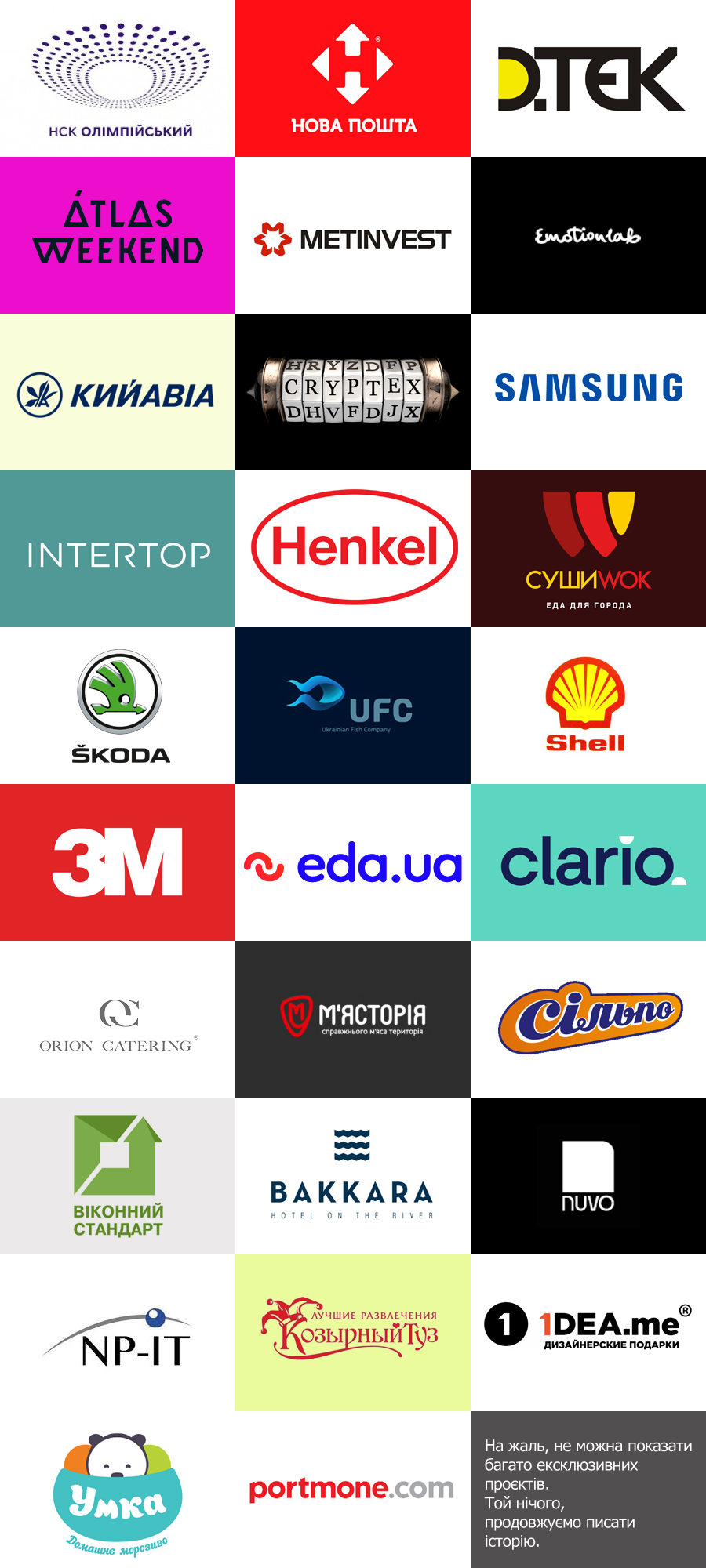 А ще зазвичай у проектах пишуть свої ачивки: ось цим щось робив, ось із цими працював, а ще ось такого знаю... Ну гаразд, спробував накидати і тут, вибачте, кого швидко не згадав, ми домалюємо, чесно-чесно! Тут до речі не лише клієнти, а й партнери та навіть друзі.